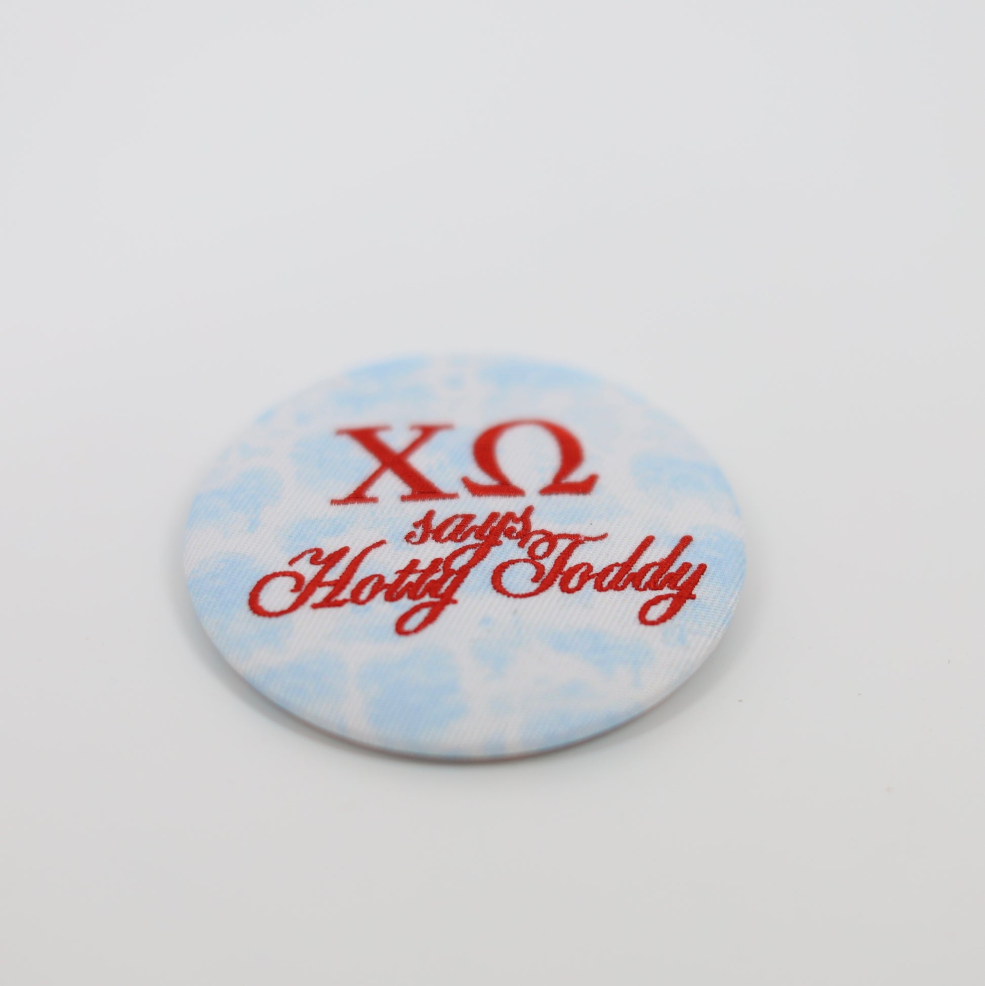 Our hand-illustrated toile button is fabric-covered and stitched with embroidered sorority letters and “Hotty Toddy.” Feather-light with a secure pin-back, it perches perfectly on your gameday outfits and clear bags - ready for The Grove, away games, Bid Day, and every gameday photo op. (Don’t see your sorority yet? Contact me to place a custom button order for your chapter.)