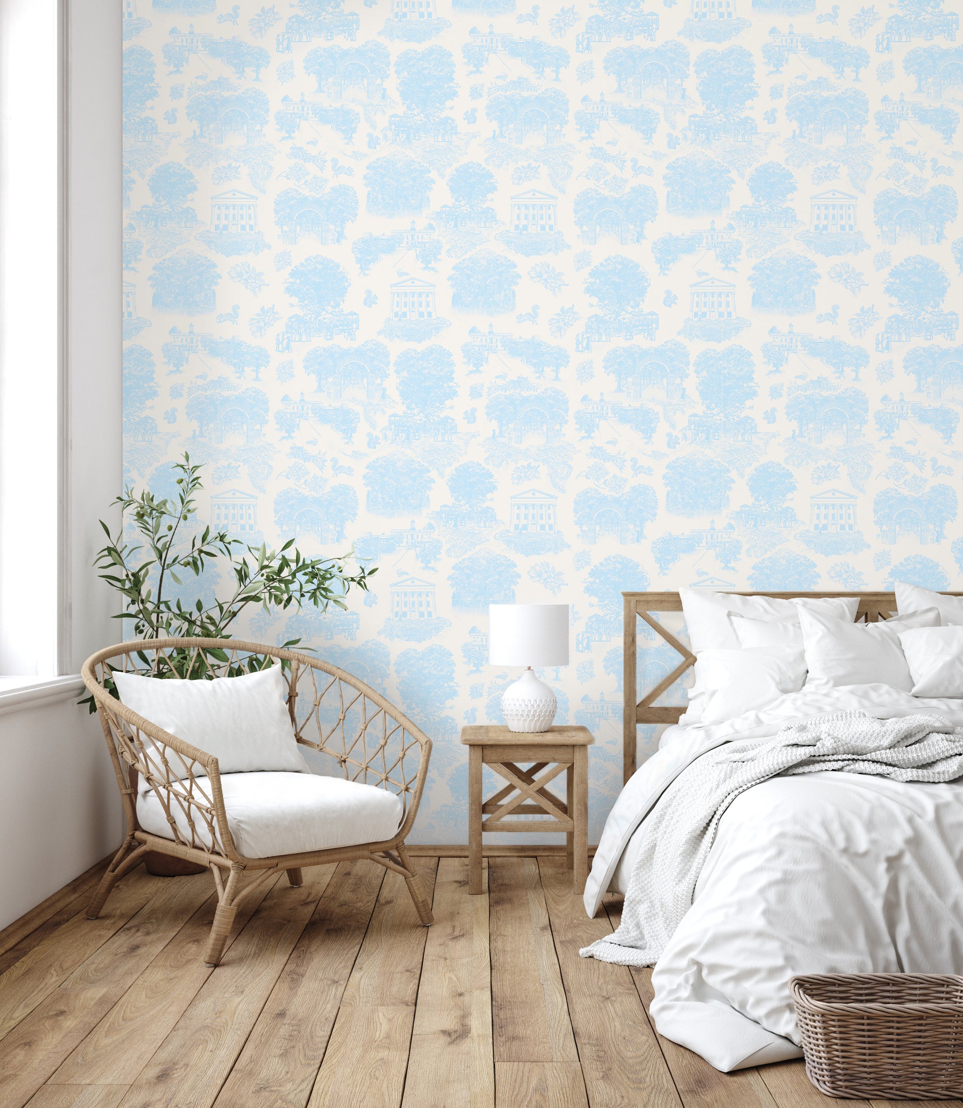 This hand-illustrated toile wallpaper brings college town charm to any space without the commitment. Printed on high-quality peel-and-stick material, it’s easy to install, remove, and reapply, making it perfect for dorms, rentals, or anyone who likes to change things up.